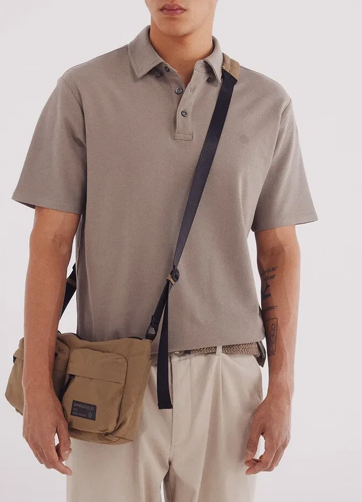 Short sleeve, slim fit piqué polo shirt styled with neck buttons for a dressier look and a tone-on-tone embroidered Springfield logo on the chest.