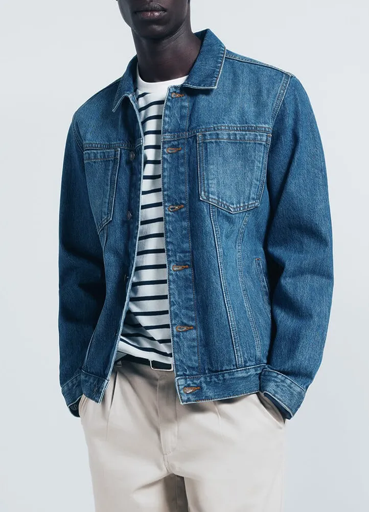 Denim jacket featuring a button closure, shirt collar, two chest pockets, and a medium-dark wash with a slightly dirty, vintage-style used look.