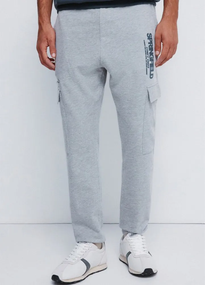 Sweatpants with cargo pockets, fake zip on a side, and a vertical logo print on the other.