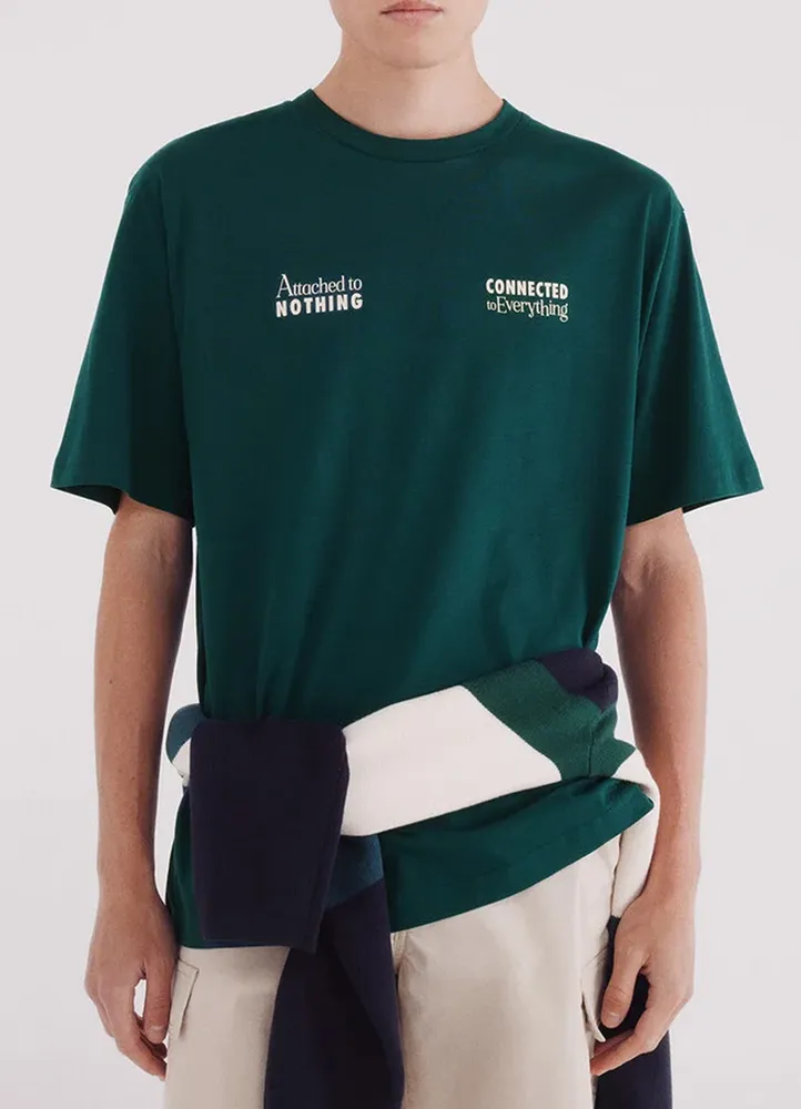 Short sleeve, crew neck, loose fit t-shirt featuring a ribbed collar, Attached To Nothing Connected To Everything text print on the chests, and a bold vertical one on the back.