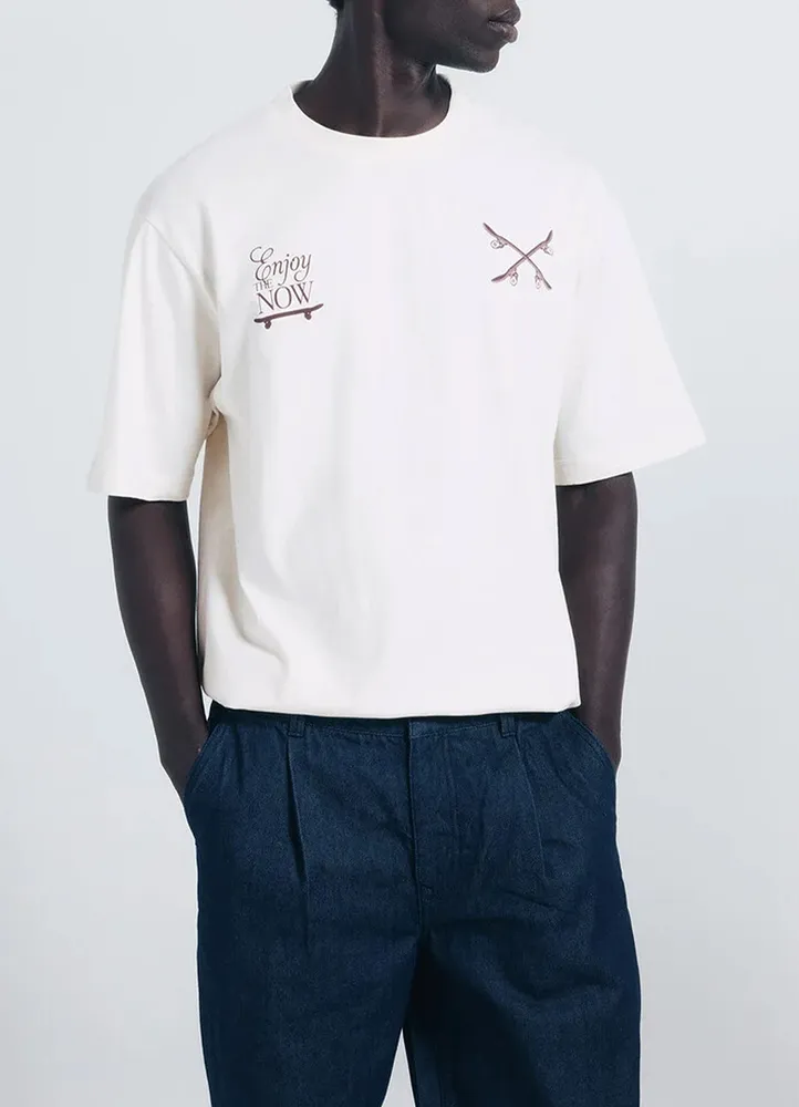 Short sleeve, crew neck, boxy fit t-shirt featuring a ribbed round neck, ENJOY THE NOW text and skateboards printed on the chests, and YOU GOT THIS NOW text and skateboards printed on the back.