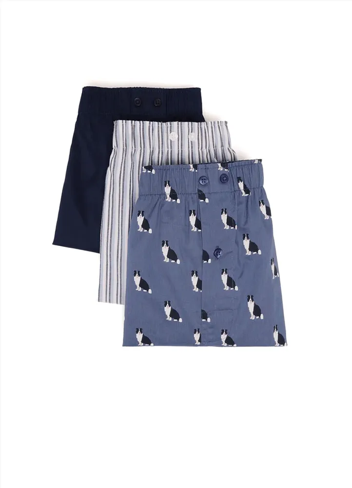Pack of three woven boxers features a soft knit-coated waistband, and a plain striped and dog prints.
