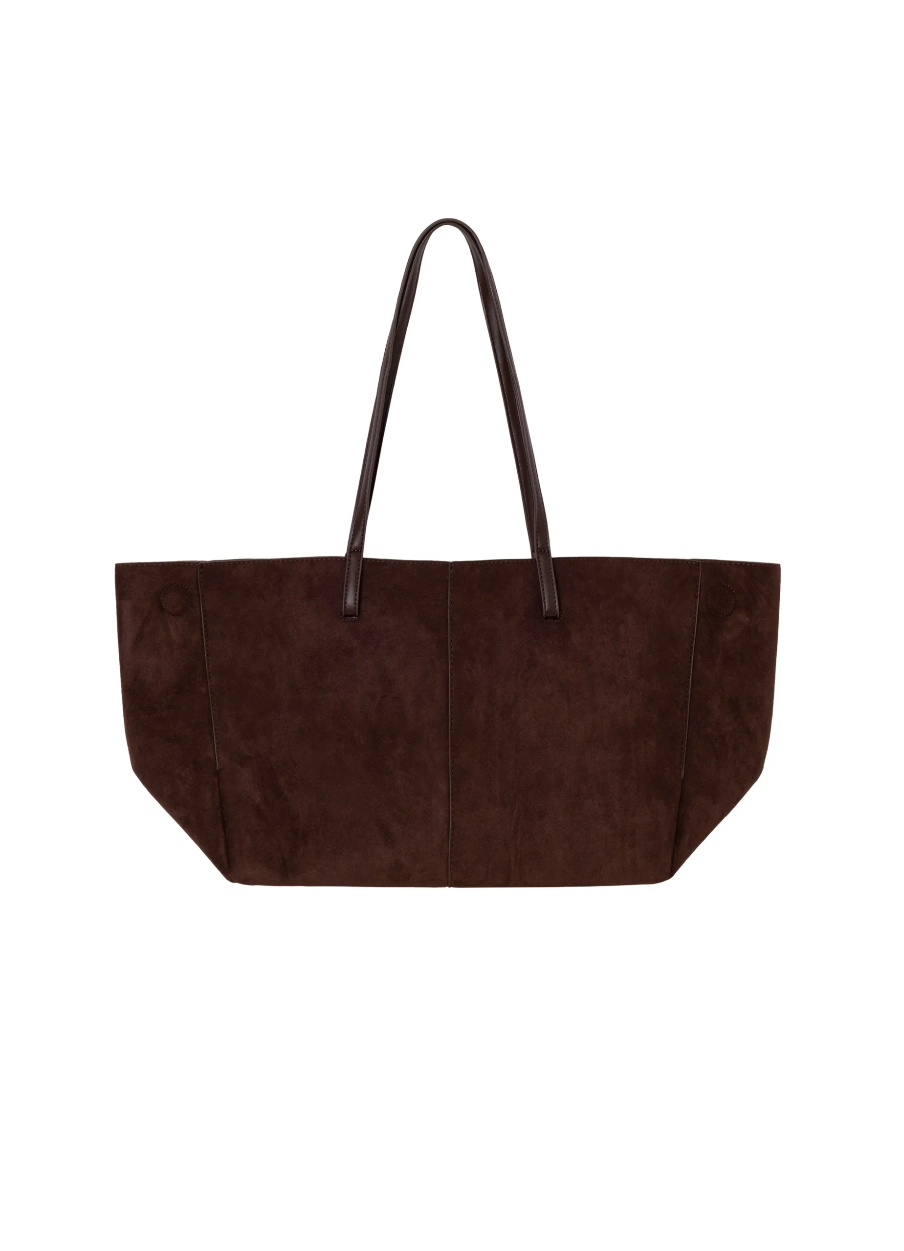 Tote bag in fake suede with two handles, and a side magnet closure.
