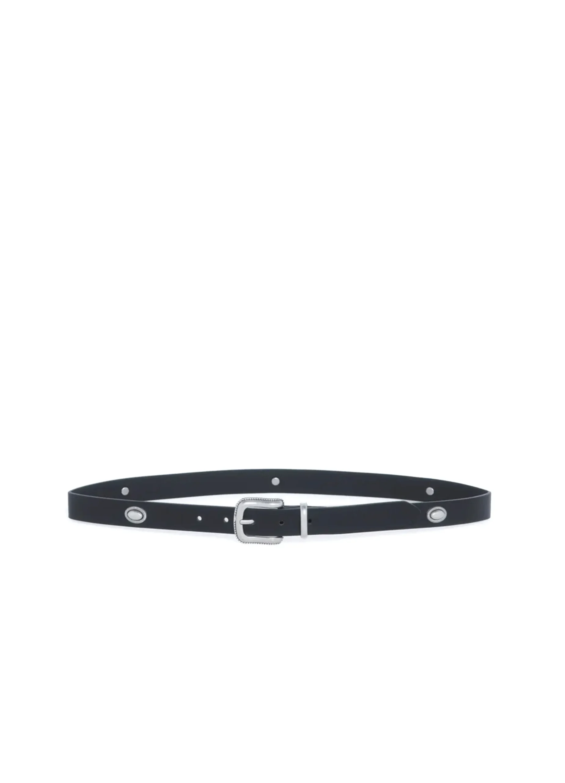 PU belt featuring large oval stud details in old silver color with a semi-square buckle.