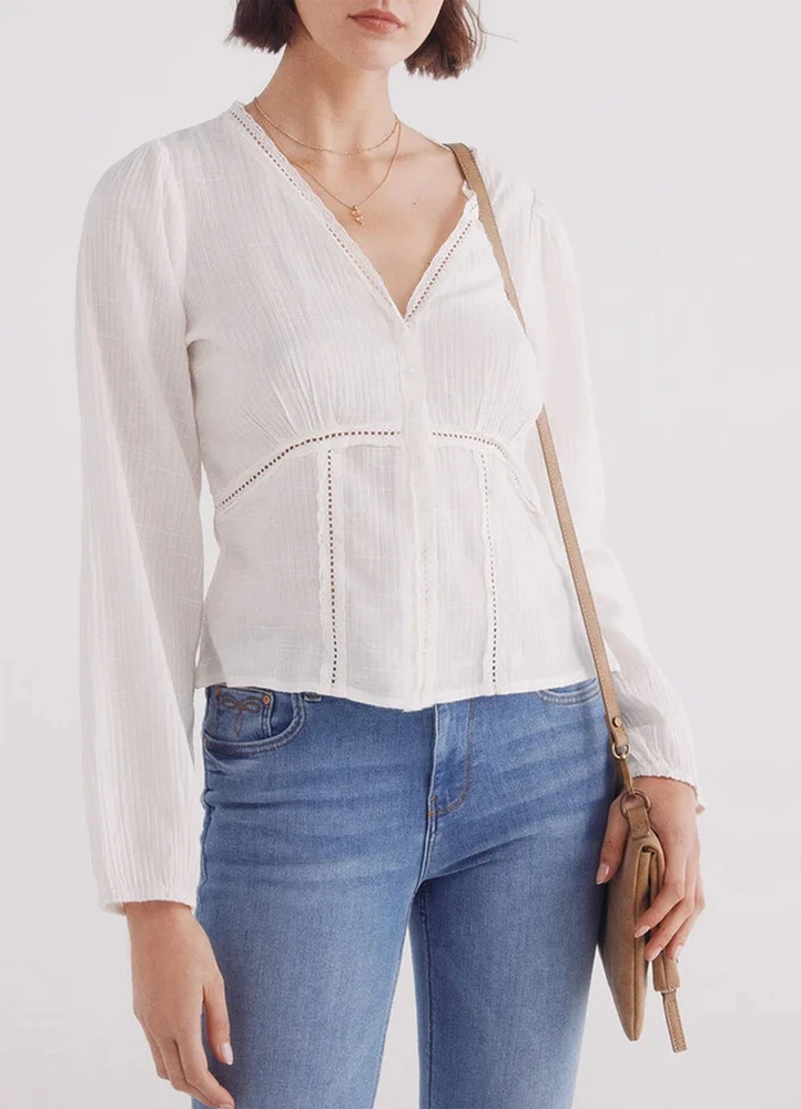 Voluminous long sleeve, V-neck blouse featuring a below-the-chest cut, lace detailing on the front, elasticized cuffs, and honeycomb smocking on the back.