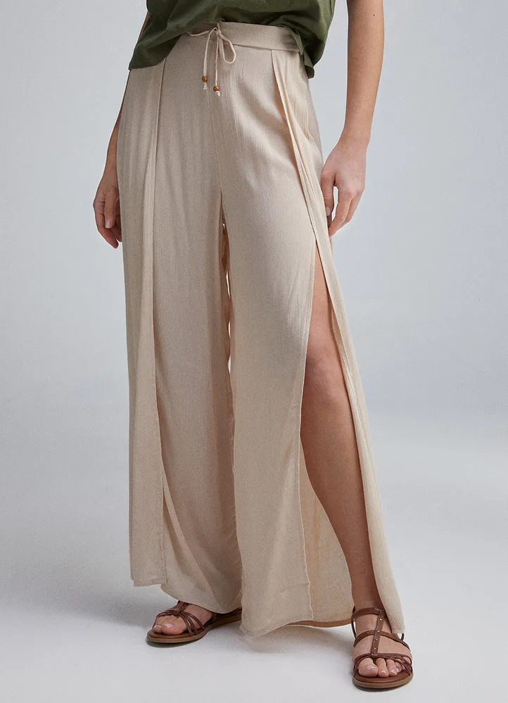 Loose fit, drawstring pants with elastic waist, a drawstring with beads, and front slits.