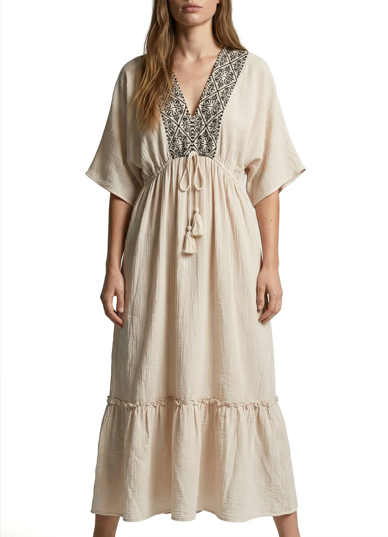 Short sleeve, V-neck, midi dress with embroidered neckline, and front cord with tassels.