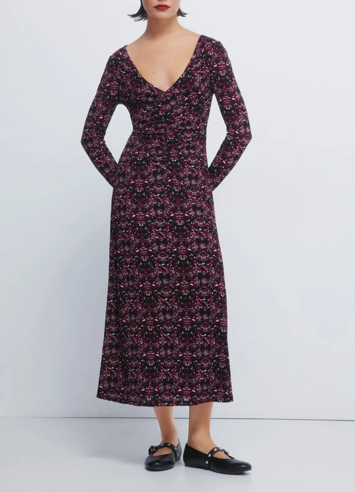 Long sleeve, V-neck, printed, midi dress with front gathering, and flared skirt.