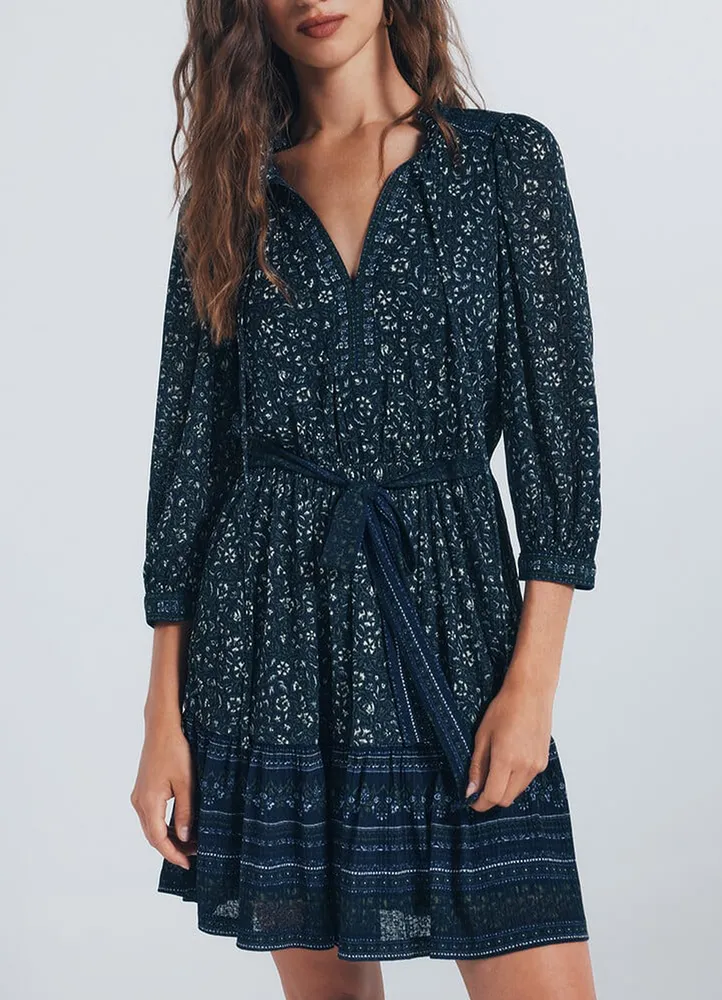 Semi long sleeve, V-neck, mini dress featuring a mini ruffled neckline, a V-shaped opening with tassel, a waist cut with a bow belt, a floral print, and decorative friezes on the shoulders, back, and skirt.