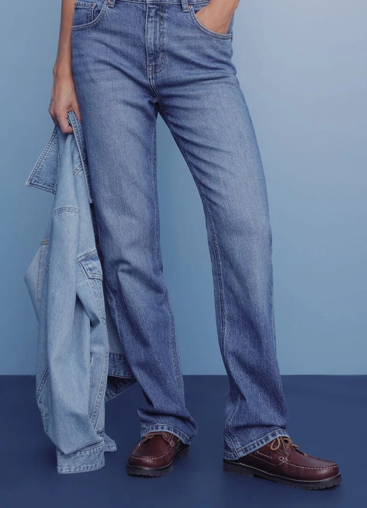 Straight fit, high waist, straight leg jeans with a button and zipper closure.