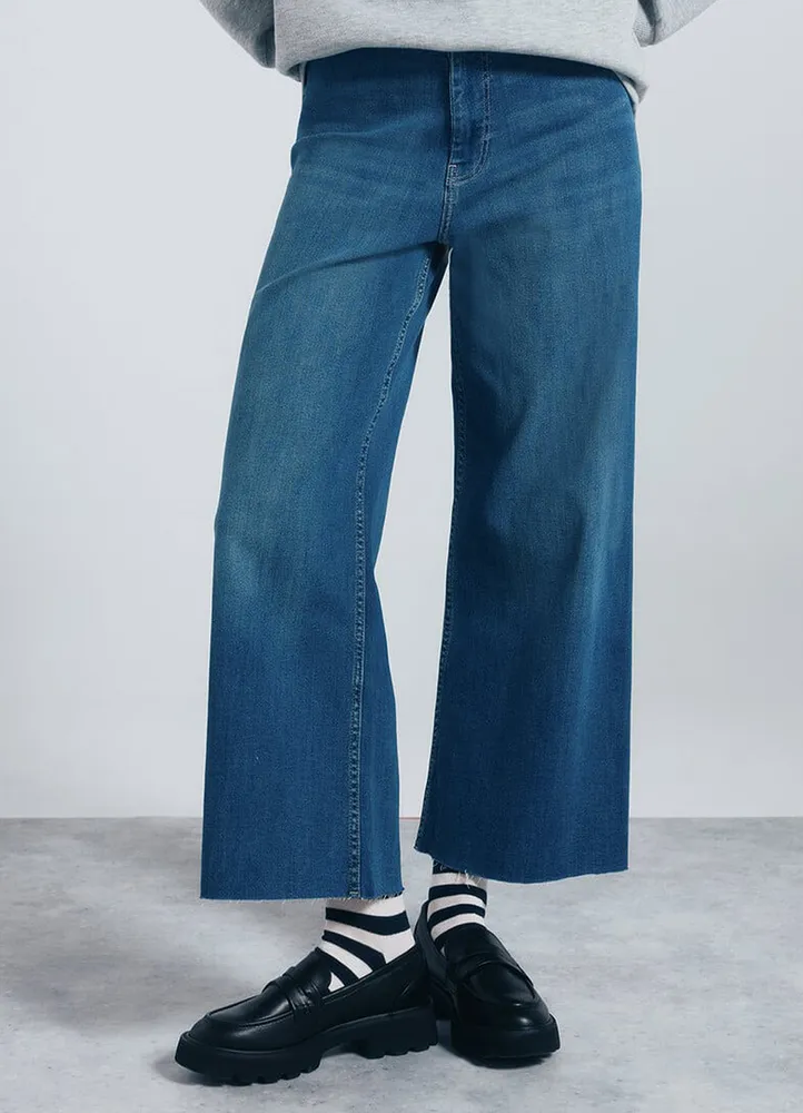 Sailor fit, high waist jeans featuring front and back pockets, a button and zipper closure, and a wide flared leg with a frayed hem.