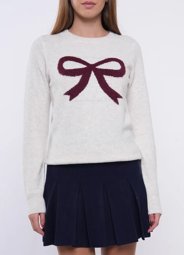 Long sleeve, crew neck sweater with bow in jacquard on the front, and ribbed endings.