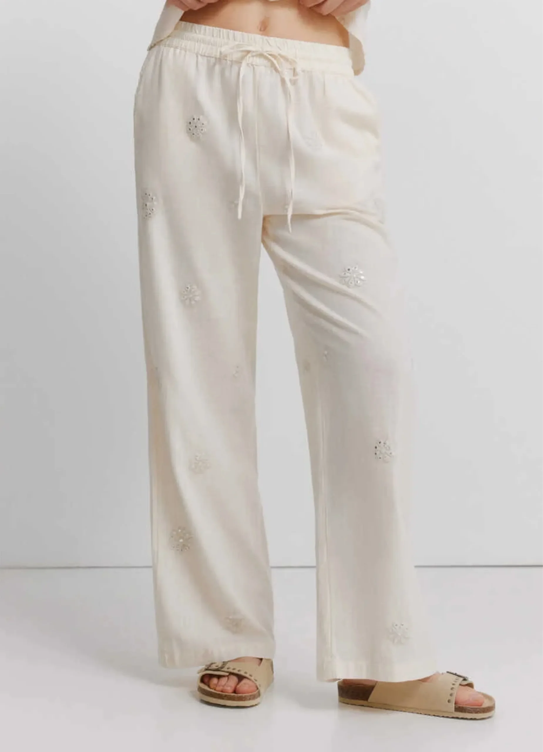 Linen, drawstring pants with embroidered flower details, an elastic waistband, and an adjustable cord.