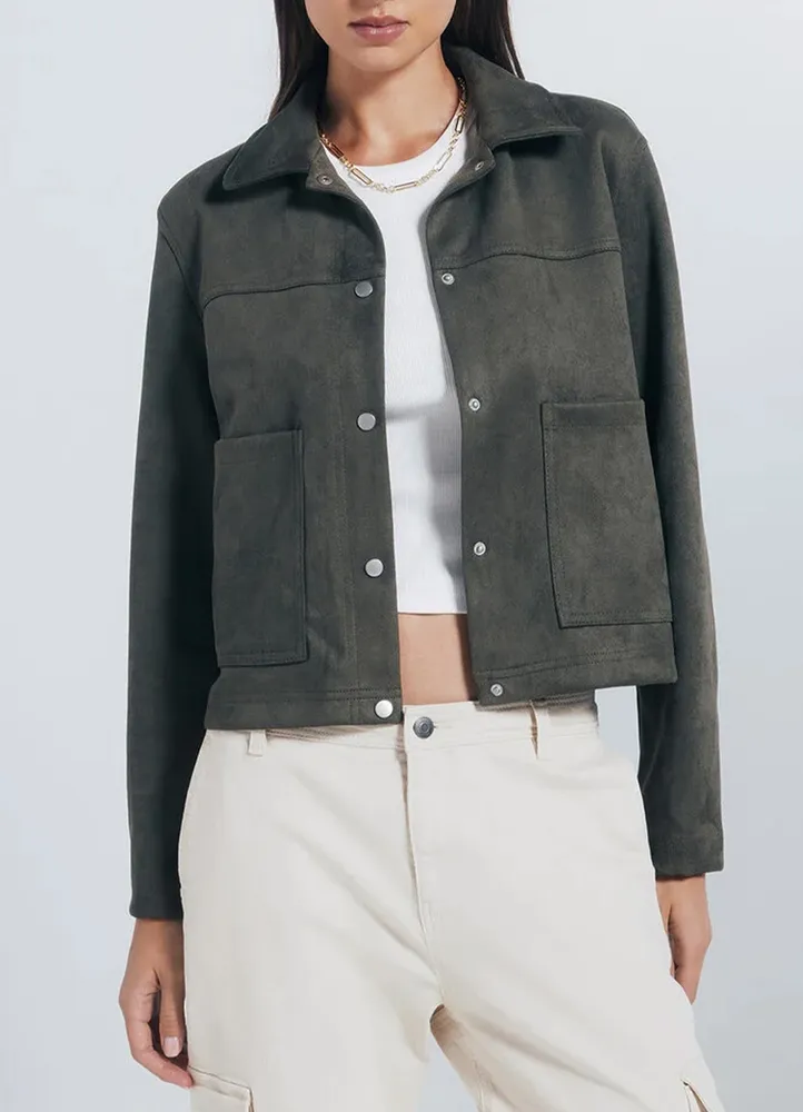 Sueded short jacket featuring a shirt collar, front patch pockets, metal snap button closure, and detailed stitching accents.
