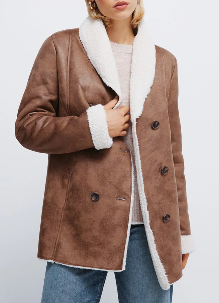 Short jacket featuring a lapel-style collar, side pockets, double breasted front buttoning, and fur details on the collar, cuffs, and interior.