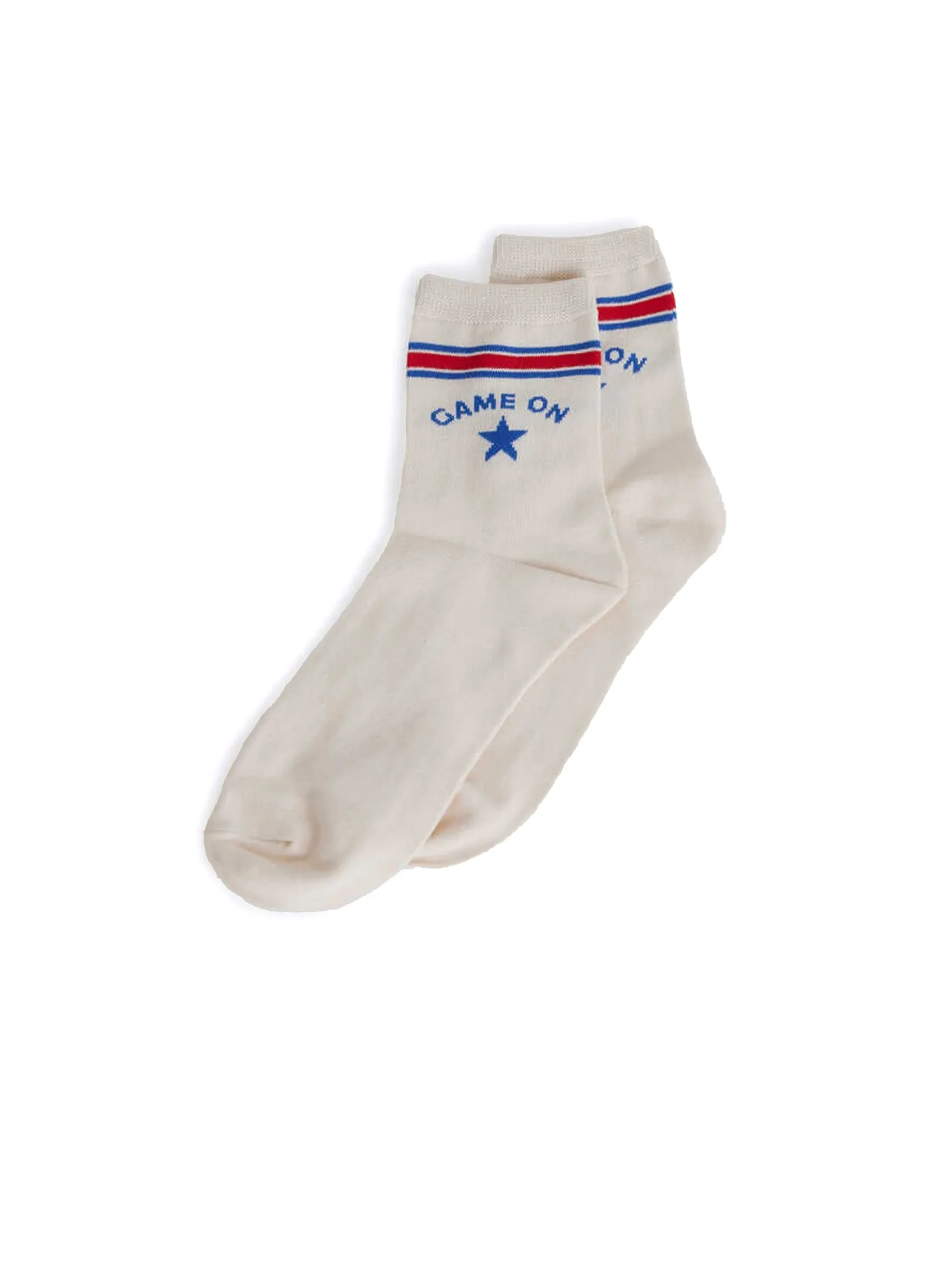 Mid socks with “Game On” text and blue and red stripes.
