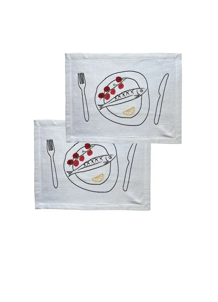 EMBROIDERED PLACEMAT OF 2 “CATCH OF THE DAY”, 100% COTTON, D: 35 X 45 CM, DO NOT WASH HOTTER THAN 30°C. THIS IS AN ARTISAN PRODUCT MADE FROM UNIQUE LINEN YARNS. VARIATIONS AND IMPERFECTIONS IN THE FABRIC ARE NORMAL AND TO BE EXPECTED