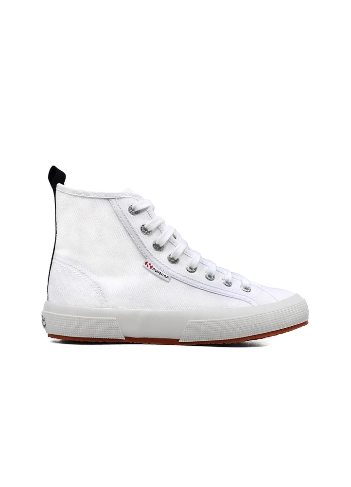 Timeless mid-top silhouette of the Superga 2750 with cotton canvas upper, which embraces and supports the ankle, lining in cotton and back tape in gross grain. The jacquard logo label and the brand original vulcanised rubber sole add a distinctive finishing touch.