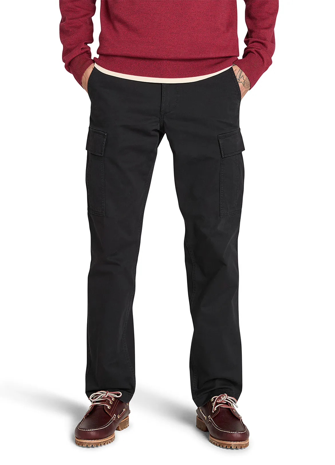 This twill cargo pant has a relaxed tapered fit, multiple pockets, a contrast internal waistband, and a 100% organically grown cotton composition.