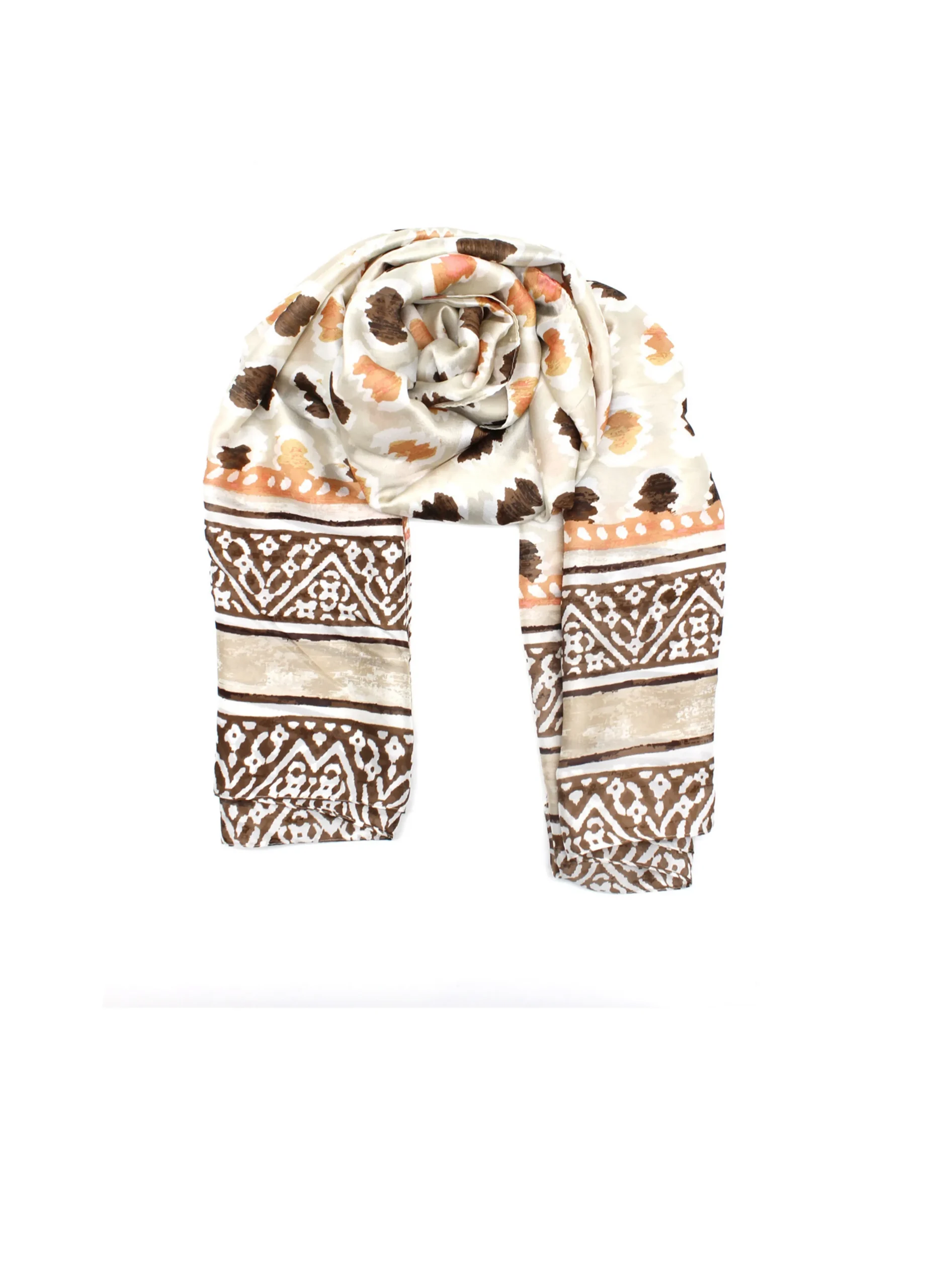 Lightweight scarf featuring a stylish print in blue, green, and beige, perfect for adding a colorful and elegant touch to any outfit.