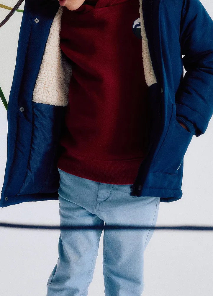 Short Jacket .Nylon jacket with front pockets with fur hood and shearling lining.100% Polyester.