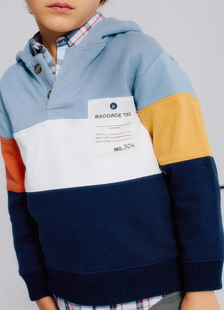 Sweatshirt Hooded.Half buttoned tricolor hooded sweatshirt with striped sleeves.100% Cotton.