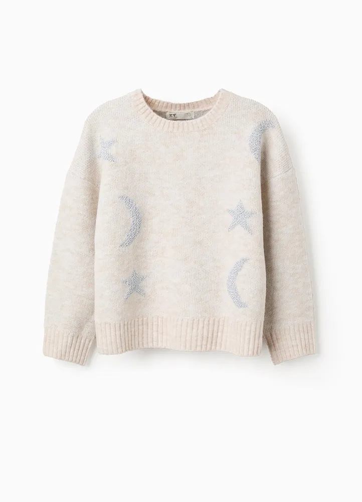 Knitwear.Lurex stars and moons knitted sweater.49% Polyester, 35% Acrylic, 14% Metallic Fiber, 2% Elastane.